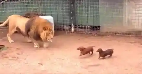 Having been abandoned by his own family, a tiny lion cub had been forwarded to the care of the park’s workers. The animal was brought to a separate enclosure far from the presence of his own family. One day the park’s workers decided to do an experiment and let two-year-old dachshunds run into his case.