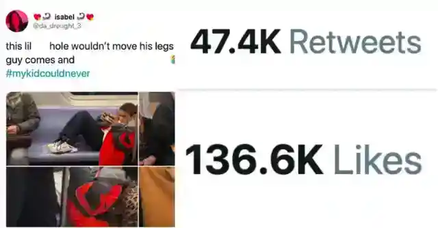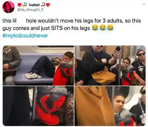 Besides, the seat underneath the kid’s legs was meant for a passenger like him anyway. The man thought it only right. The kid’s reaction to this says it all . . .