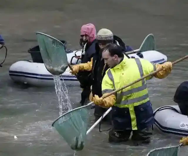 まず魚たちを避難させる必要があった。3日間にわたり、清掃チームはブリーム、マス、コイを捕まえては、水路の別の安全な区域に移動させる作業に奔走した。