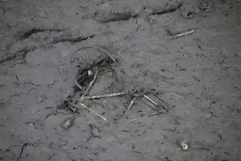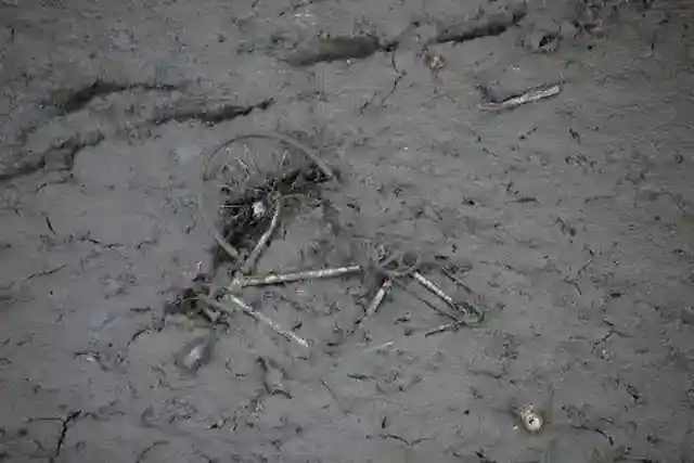 自転車やオートバイのほかに、ショッピングカート、椅子、ゴミ箱、スーツケースなどが泥だらけの地面に散乱していた。
